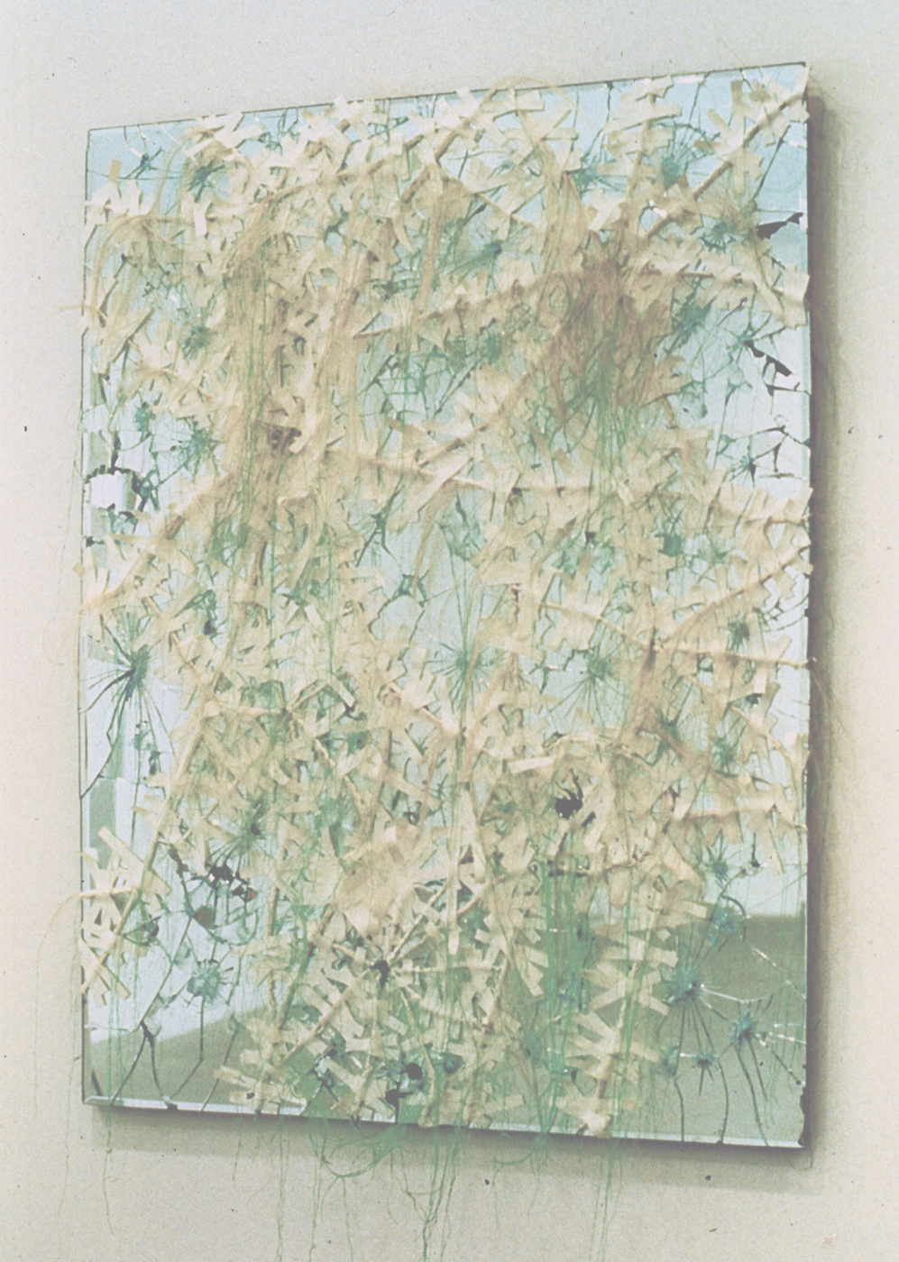 Mirror, hair, dental floss, adhesive tape, caulk.